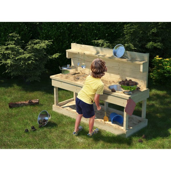 - Natürliches Design: Durch das naturbelassene Holz fügt sich die Matschküche harmonisch in jeden Garten ein.