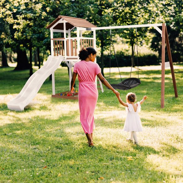 Axi Beach Tower Spielturm mit Roxy Nestschaukel Braun – Weiß und Weißer Rutsche
