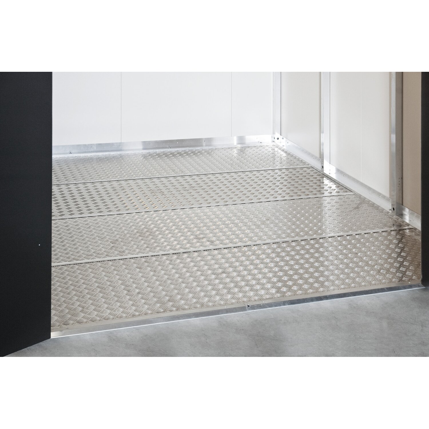 Die Bodenplatte besteht aus hochwertigem, verzinktem Stahlblech, das extrem robust und witterungsbeständig ist.
