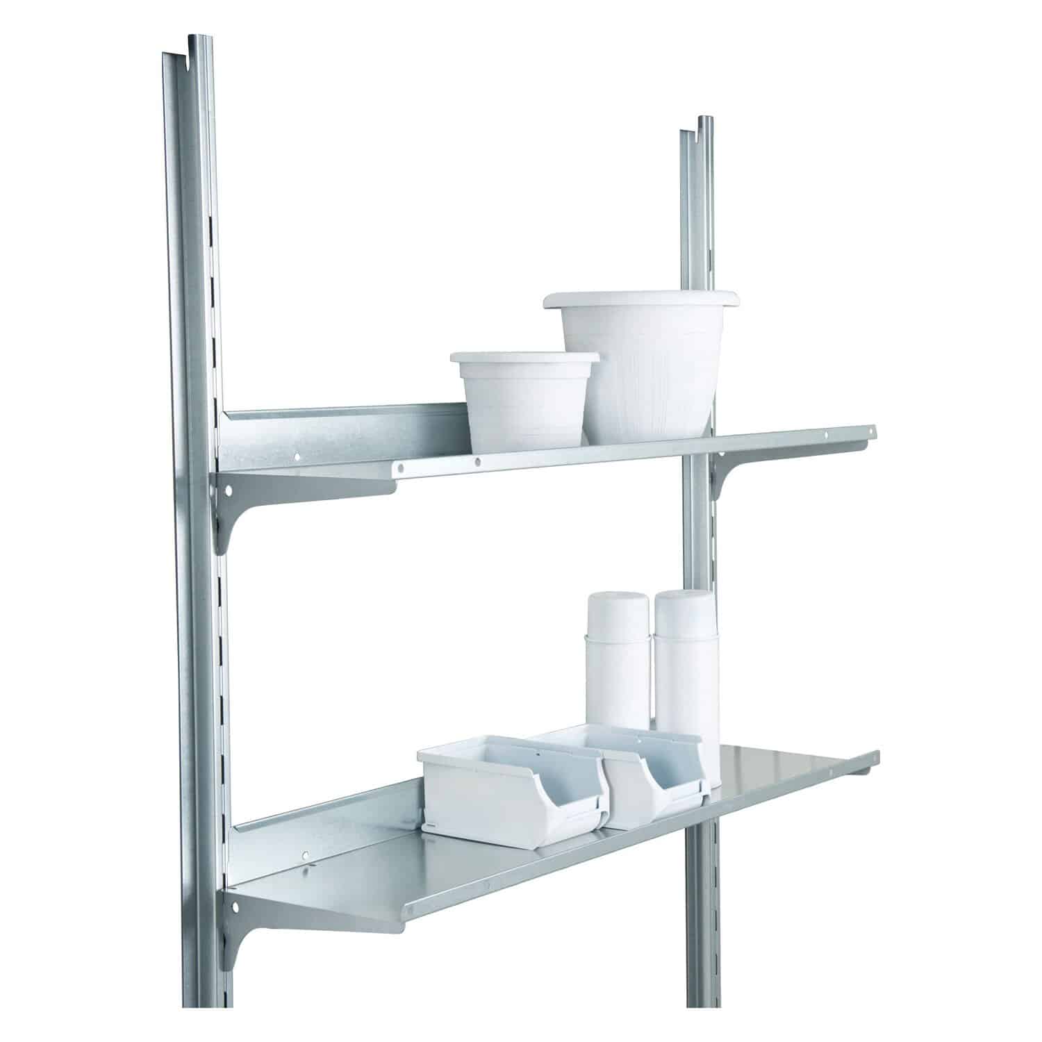 Das Regale-Set besteht aus hochwertigem, verzinktem Stahlblech, das besonders langlebig und korrosionsbeständig ist.
