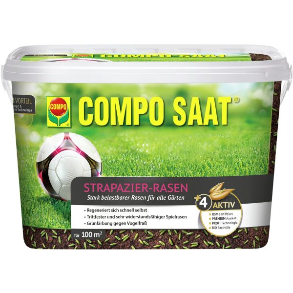 Die spezielle Zusammensetzung von Compo Saat Strapazier-Rasen sorgt für eine dichte Grasnarbe, die Unkrautwachstum effektiv unterdrückt. Das bedeutet weniger Arbeit für Sie und mehr Zeit, um die schönen Seiten des Gärtnerns zu genießen. Die hohe Regenerationsfähigkeit des Rasens sorgt dafür, dass kleine Schäden schnell wieder zuwachsen, sodass Ihr Rasen immer gepflegt aussieht.