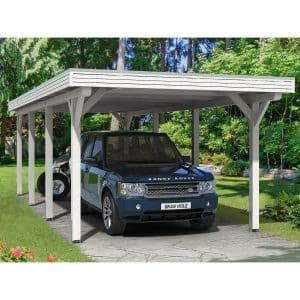 Skan Holz Doppelcarport Wendland Weiß +Anbau 630×879 cm EPDM-Dach Blende Rot