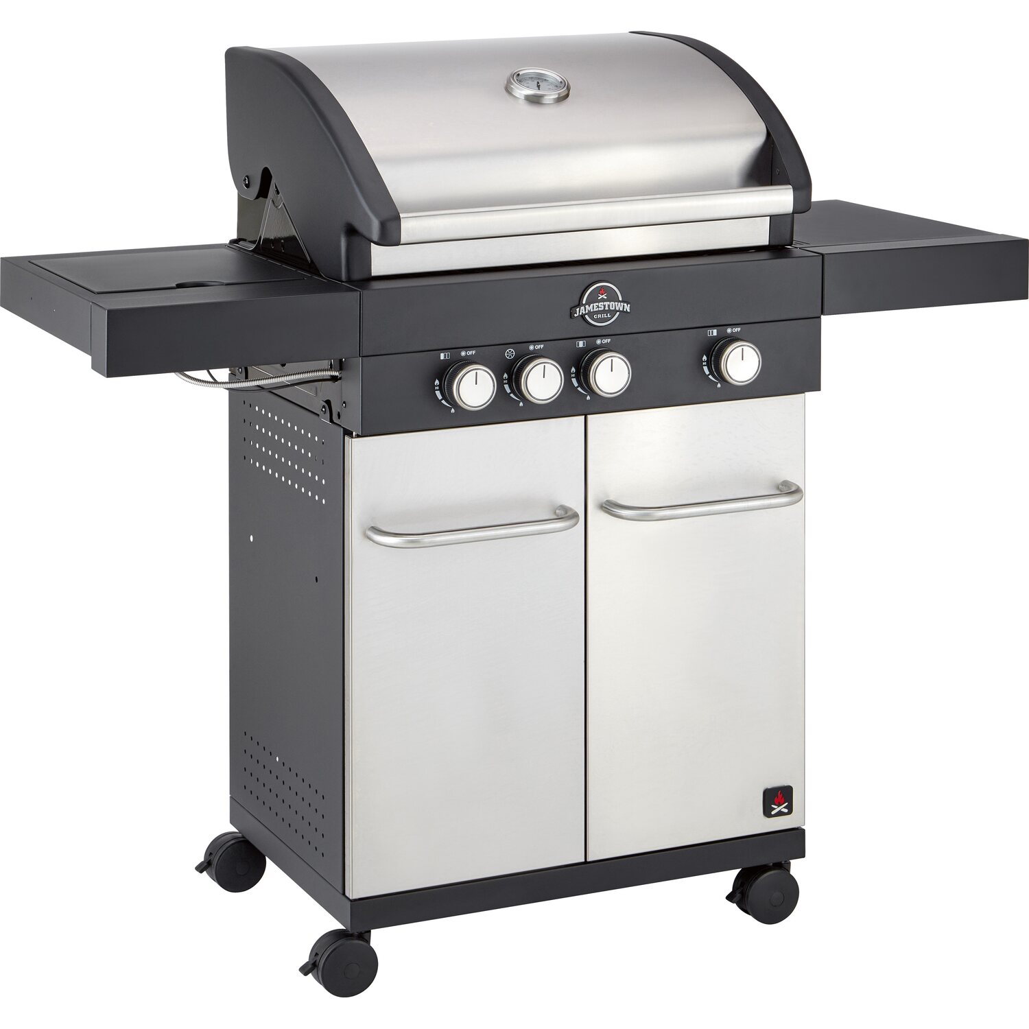Mit dem Jamestown 3-Brenner Gasgrill Maddox legen Sie direkt los: Der Grillwagen bietet Ihnen und Ihren Freunden jede Menge Grillspaß ohne Rauch, Anglühen und Schmutz. Durch das indirekte und direkte Grillen bleiben keine Wünsche offen: Genießen Sie leckere Würstchen, braten Sie Fleisch an und servieren Sie köstliches Grillgemüse. Noch vielfältigeres Grillvergnügen bietet der Seitenbrenner zur Zubereitung von Beilagen. Jamestown – Taste something different Jamestown ist die Marke für Kenner und Genießer und bietet Ihnen einen hochwertigen Grill für ein leckeres Essen sowie eine gute Zeit mit Ihren Liebsten. Dabei lässt sich der Gasgrills leicht bedienen und kann unkompliziert gereinigt werden. 3-Brenner Gasgrill mit überzeugender Leistung Für ein ordentliches Einheizen verfügt der Gasgrill über drei Edelstahlbrenner mit einer Gesamtleistung von 13,5 kW. Diese sind getrennt regelbar und lassen sich unabhängig voneinander zünden. Mit seiner Piezo-Zündung startet der Grill schnell und leicht. Damit Sie die Temperatur im Garraum genau regulieren können, ist der Grillwagen mit einem Deckelthermometer ausgestattet. Der Grillrost aus emailliertem Gusseisen sorgt für besonders schmackhaftes Grillgut. Mit dem praktischen Warmhalterost können Sie Ihre Speisen jederzeit warm halten. Das Leben ist ein Genuss – Jamestown Grillwagen mit praktischen Extras Mit dem Seitenkocher können Sie zusätzlich in einem Topf oder in der Pfanne verschiedene Beilagen und Soßen für Ihr Barbecue zubereiten. Für einen leichten Transport zur gewünschten Grillstelle ist der Gasgriller mit Rollen versehen. Damit Sie Gasflaschen ordentlich verstauen können, verfügt er zudem über einen geräumigen Unterschrank. Auf dem klappbaren Seitentisch lässt sich verschiedenes Grillzubehör unkompliziert platzieren. So haben Sie Gewürze, Besteck oder anderes Zubehör schnell zur Hand. Auch der Seitenbrenner lässt sich bei Nichtgebrauch als Ablage nutzen. Einsatz für alle Fälle: Nutzen Sie das clevere Modular System Durch die Nutzung des Modular Systems, lässt sich der Gasgrill auch zum Pizza backen, Braten und als Wok verwenden. Hierfür brauchen Sie lediglich den Einsatz im Grillrost auswechseln. Einsätze sind separat erhältlich.