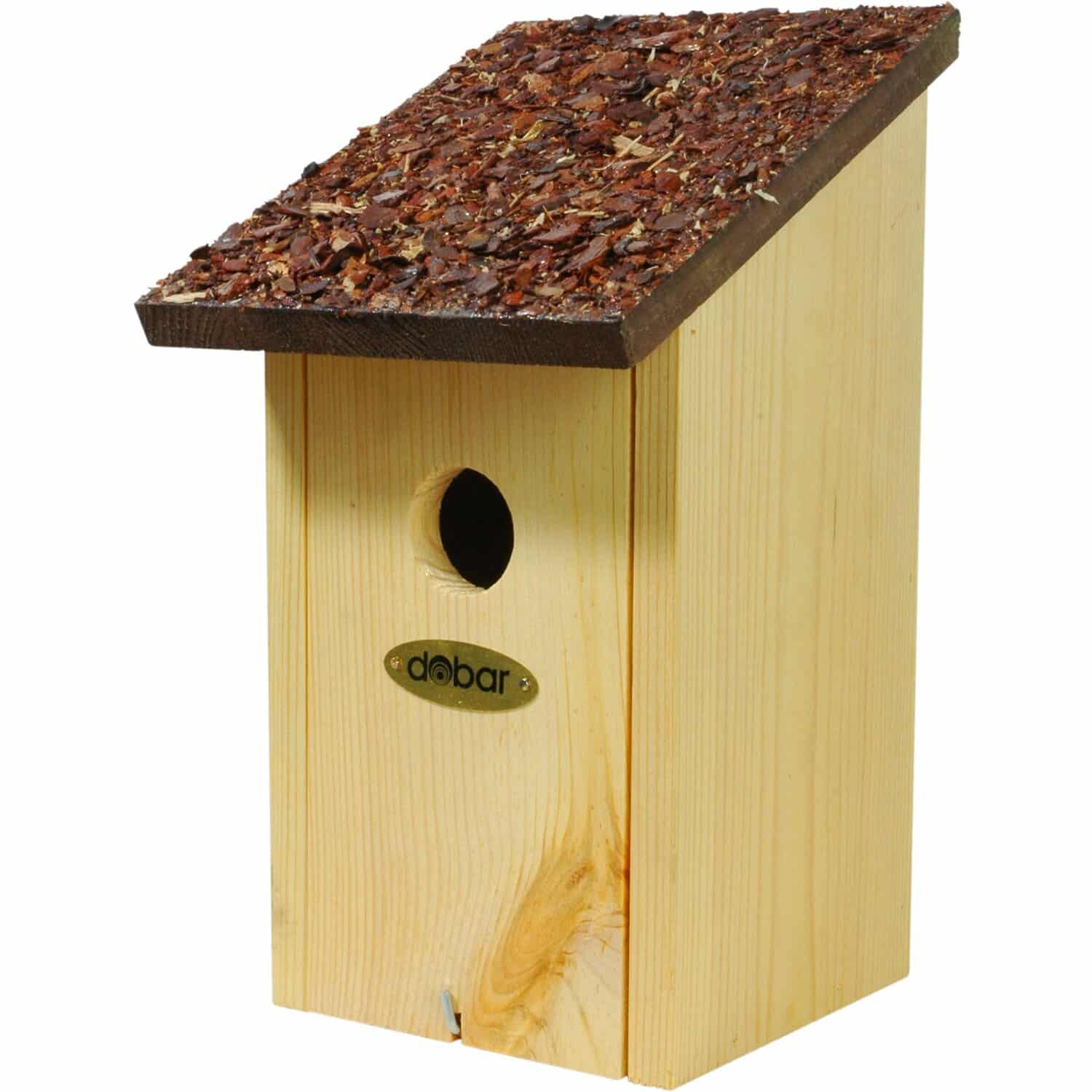 Der Nistkasten besteht aus unbehandeltem Holz und hat ein Dach aus echter Baumrinde. Dadurch ist er besonders natürlich und bietet den Vögeln ein artgerechtes Zuhause.