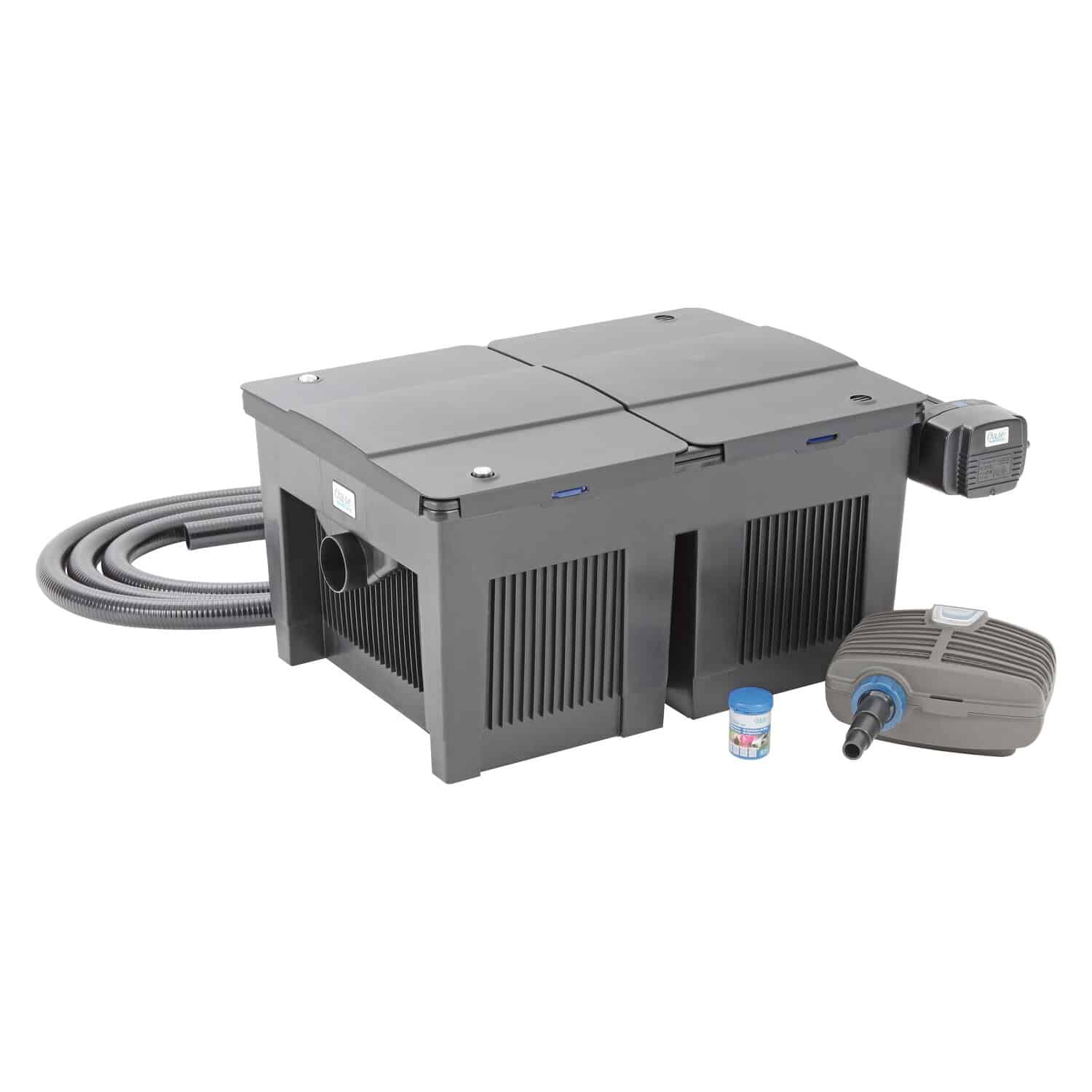 Das Set enthält den BioSmart Durchlauffilter, eine Filterpumpe, ein UVC-Vorklärgerät und das benötigte Anschlussmaterial.