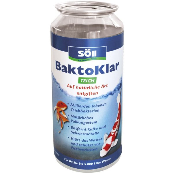 BaktoKlar bereitet ganz ohne chemische Zusätze das Teichwasser natürlich auf. Das enthaltene Naturmineral Klinoptilolith bindet selektiv Ammonium, Schwermetalle und Toxine. Auf natürliche Art entgiften Wertvolle Nahrungsbestandteile und Vitamine werden nicht gebunden und bleiben für die Fische verfügbar. Hocheffiziente Bakterienkulturen bauen organische Schadstoffe ab und neutralisieren Ammonium, Nitrit und Nitrat. Der biologische Schadstoffabbau im Filter wird nachhaltig verbessert und die Standzeit deutlich verlängert. Klärt das Wasser und schützt vor Fischverlusten BaktoKlar verteilt sich schnell im Wasser und entfaltet seine Wirkung optimal. Das Ergebnis ist schadstofffreies, klares Wasser mit gesunden, vitalen Fischen. Anwendung BaktoKlar ist ideal geeignet nach Filterreinigung, Wasserwechsel und bei Besatzerhöhung. Der Teich kann nach der Anwendung kurz eintrüben. Je nach Wasserbelastung wird eine regelmäßige Wiederholung der Anwendung alle drei Wochen empfohlen. Eine Portion (450 ml) ist ausreichend für bis zu 5.000 Liter. Beugt Umkippen vor ZisternenFrisch bewahrt das Sammelwasser vor dem Umkippen. Das Regenwasser bleibt frisch für jeden Einsatzzweck.