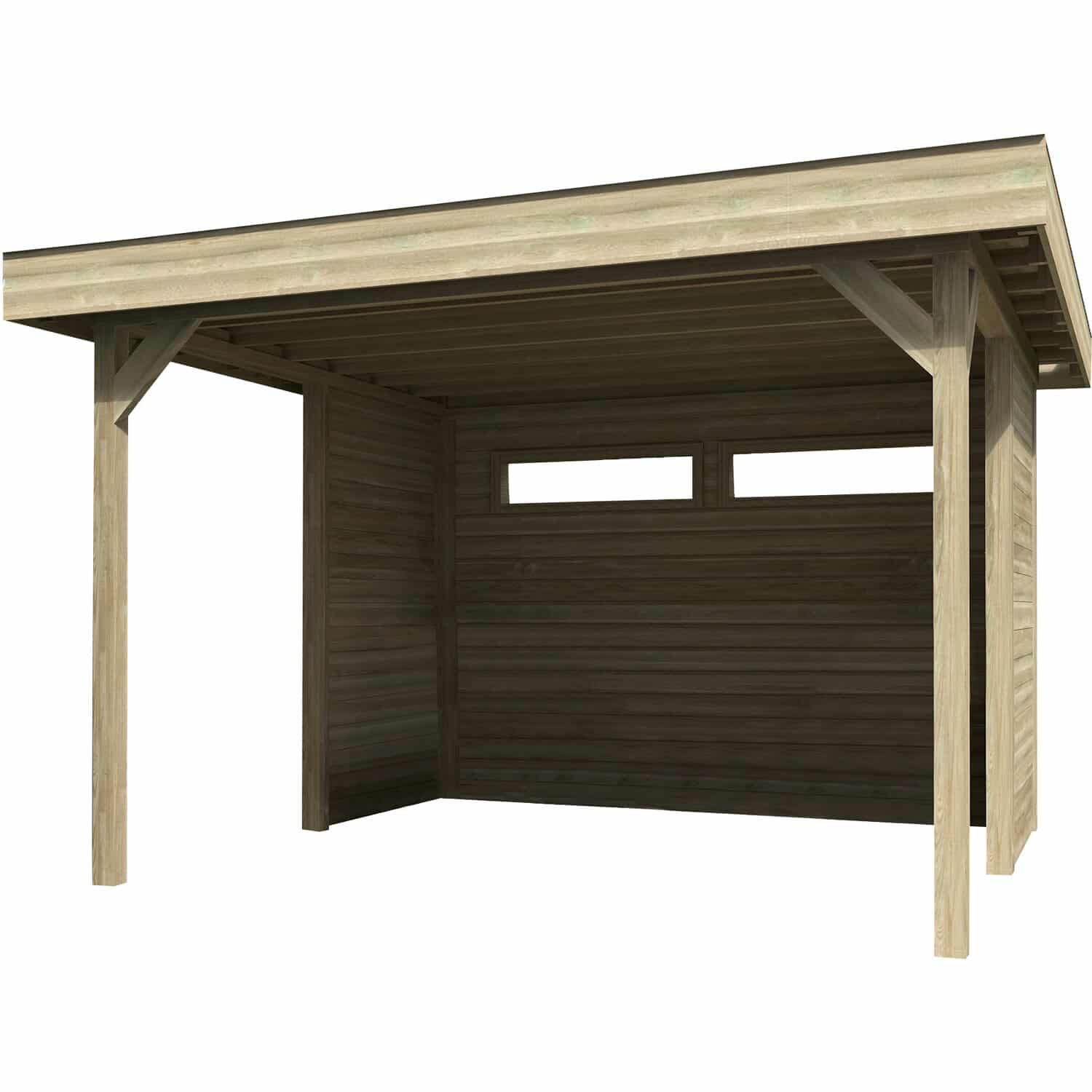 Das Komplettset enthält alle benötigten Holzteile, Beschläge, eine detaillierte Montageanleitung und Bitumendachbelag zur Ersteindeckung. Werkzeug und Fundament sind nicht im Lieferumfang enthalten.