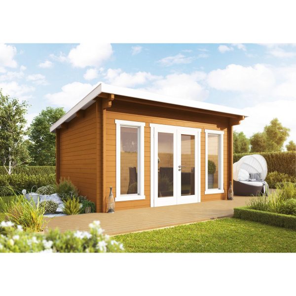 - Massive Blockbohlenbauweise: Die 44 mm starken Blockbohlen aus hochwertigem nordischem Fichtenholz garantieren Stabilität und Langlebigkeit.